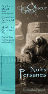 « Nuits persanes » explore ce rêve d’Orient au travers de pièces pour voix et instruments, arrangées pour flûte, oud et violon, ponctuées de quelques poésies des « Nuits persanes » d’Armand Renaud qui stimulent nos sens et notre imaginaire par l’évocation des paysages, des odeurs et des atmosphères fantasmées de la Perse du XIXe siècle.